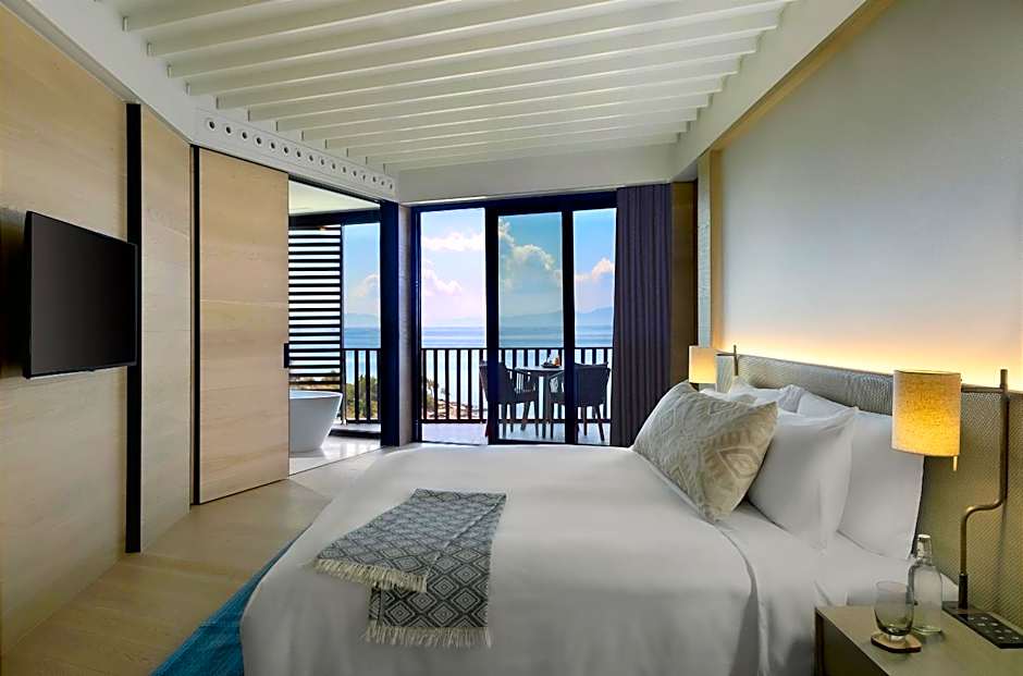 This twin room has a balcony, tile/marble floor and sea view. Modernly decorated, this room features a twin bed with a flat-screen TV, sofa and desk. A walk-in closet and dressing room are provided. Floor-to-ceiling windows open to a private balcony with panoramic views of the Aegean Sea. Guests can use the table and chairs in the balcony. Private bathroom comes with a bathtub, hairdryer, free toiletries, bathrobe, toothbrush and slippers. Mood lighting and climate control are modified by an iPad.